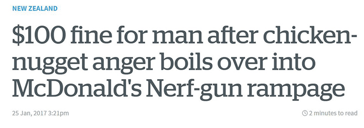 And Olsen isn’t the only nuggy fiend causing trouble at McDs. Back in January, Jacob Martin Geels, 22, was fined for disorderly behaviour in the Greymouth District Court, after a rampage in a Hokitika McDonald’s. When his nuggets didn’t materialise in a timely fashion, Geels jumped on the counter with duel-wielded nerf guns, shot foamy projectiles at staff and screamed obscenities at everyone within earshot.