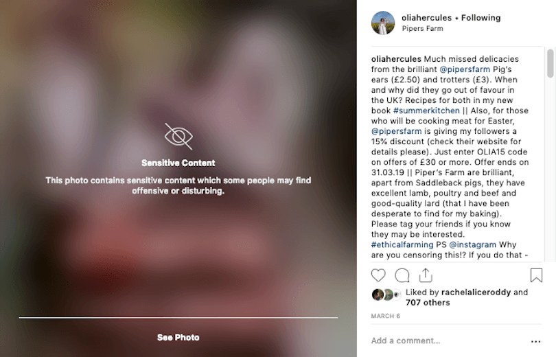 In a bid to soothe this initial flood of confusion and frustration, I went searching for answers – maybe Instagram doesn’t have a say in sensitive content? Maybe a couple of people flagged it as inappropriate because they personally found it offensive (I jolly well hope this means they’d report a rasher of crispy bacon) and that triggered a warning?