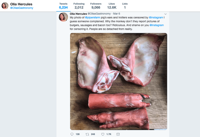 The censorship of a food writer’s Instagram post of piggy trotters and ears on a kitchen bench is a disturbing example of how disconnected from our food we really are.