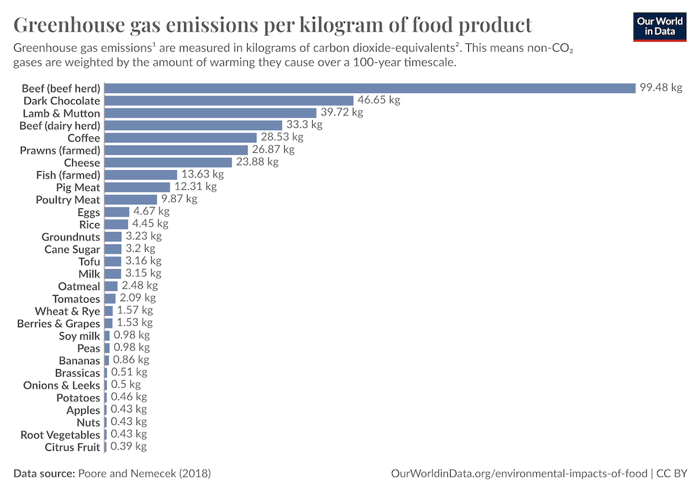 Beef is by far the worst meat you can eat in terms of greenhouse gas emissions, according to both global and local data, with lamb runner-up. Chicken, on the other hand, is not too bad – 3.97 kg Co2e/kg compared to 21.43 kg Co2e/kg for beef – and ditto yoghurt, eggs and tinned tuna.
