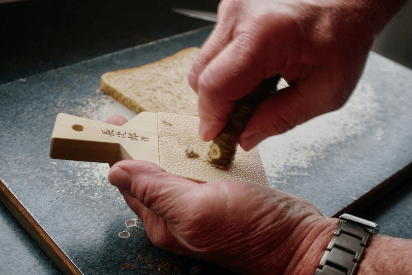 After about an hour and a half of wasabi chat, Wood prepared us some to try, using the traditional tool for the job – a sharkskin grater. Wasabi’s pungency comes courtesy of isothiocyanates, a specific molecule found in cruciferous plants. These molecules must be disturbed or crushed in order to release their flavour. “Never lend one of these to a chef,” Fenton cautioned of the grater. “Chances are it won’t return – lost accidentally, of course.”