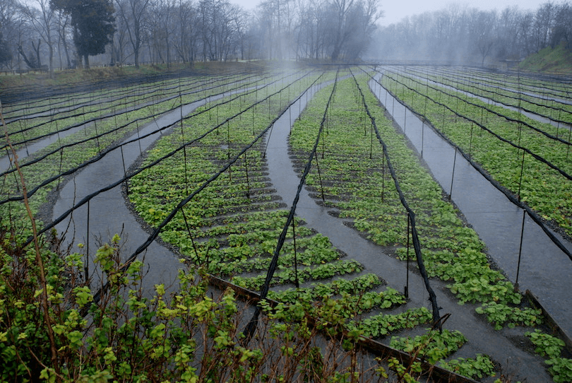 On top of wasabi’s preference for incredibly clean and constantly moving water, it requires specific temperature and humidity too. And while it grows best in waterways, wasabi also needs almost complete shade. Shade cloths are usually draped over the beds.