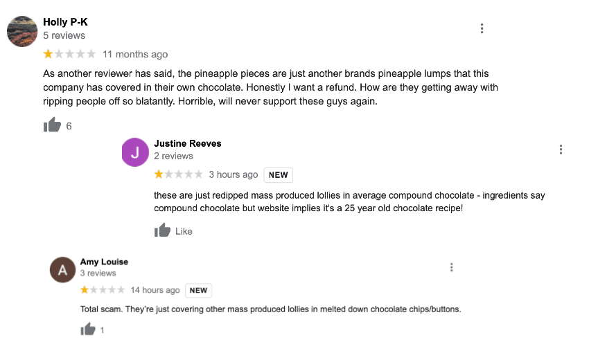 Adele’s not alone in her concerns. A Reddit user this week said they purchased the Potter Brothers pineapple chews in Queenstown recently and were left convinced they were just “re-dipped pineapple lumps”. Similarly, on Google, a handful of one star reviews dating back two years make identical claims about the quality of the Potter Brothers products. “The pineapple pieces are just another brand’s pineapple lumps that this company has covered in their own chocolate. Honestly I want a refund,” one person said.