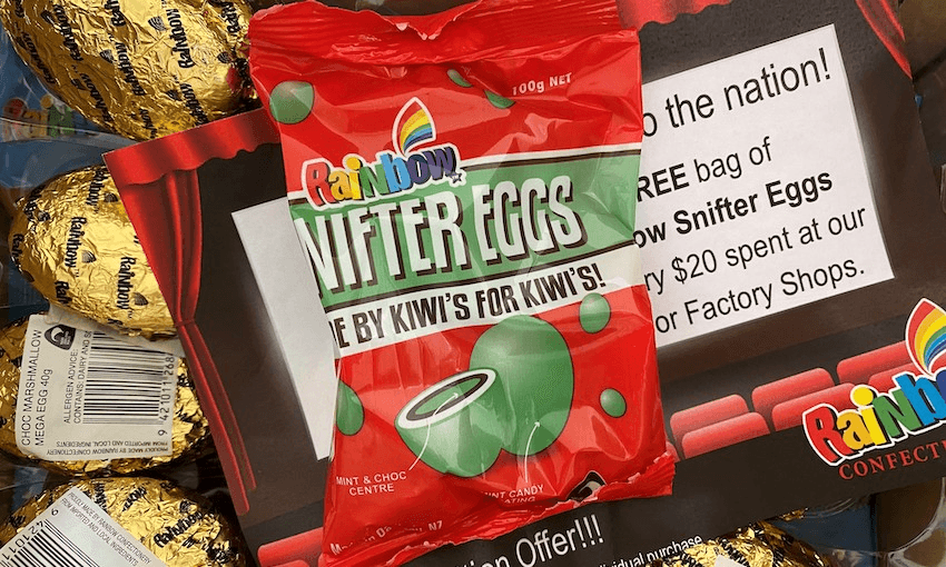 But once again, Rainbow Confectionery has proven them wrong. In a scornfully casual gesture, Rainbow is not only making the terribly difficult Snifters again, they are giving them away to New Zealand shoppers – for free. Now. Today, this week. The bricks-and-mortar shop in Ōamaru may be closed, but the online deliveries will run throughout the lockdown. For every online purchase you make over $20, Rainbow promises to send you a free packet of its new Snifter Eggs.