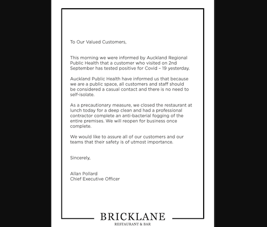 Bricklane, which was visited between 12pm and 1.30pm on Wednesday September 2, posted an update to its Facebook page this afternoon, in which CEO Allan Pollard said his business was informed this morning that a customer had tested positive.