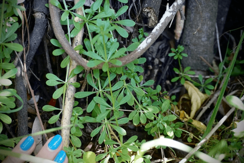 Cleavers are easy to spot in that you don’t find them, they find you. Also called “sticky foot”, this clinging plant’s distinctive leaves have a velcro texture which is kinda off-putting.