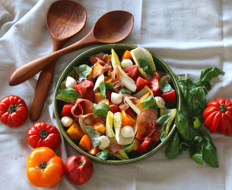 This heirloom tomato and nectarine salad by Michael Meredith is a thing of beauty, balanced between salty jamon, creamy bocconcini, fresh basil, bitter witloof – and, of course, the sweetness of that wonderful nectarine.