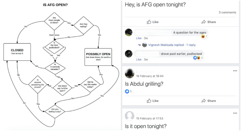 Scrolling back through the posts, it’s people coming up with more and more creative ways to say the one thing: is it open? The frequency and the palpable hope in each post shows the devotion that Abdul has developed through his restaurant, and the ingenious marketing strategy that he has created, whether intentionally or otherwise.