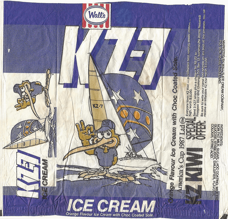 1987 Walls KZ-7 Kiwi America’s Cup Ice Cream Wrapper. “Great graphics! I remember the hype around the America’s Cup well.”