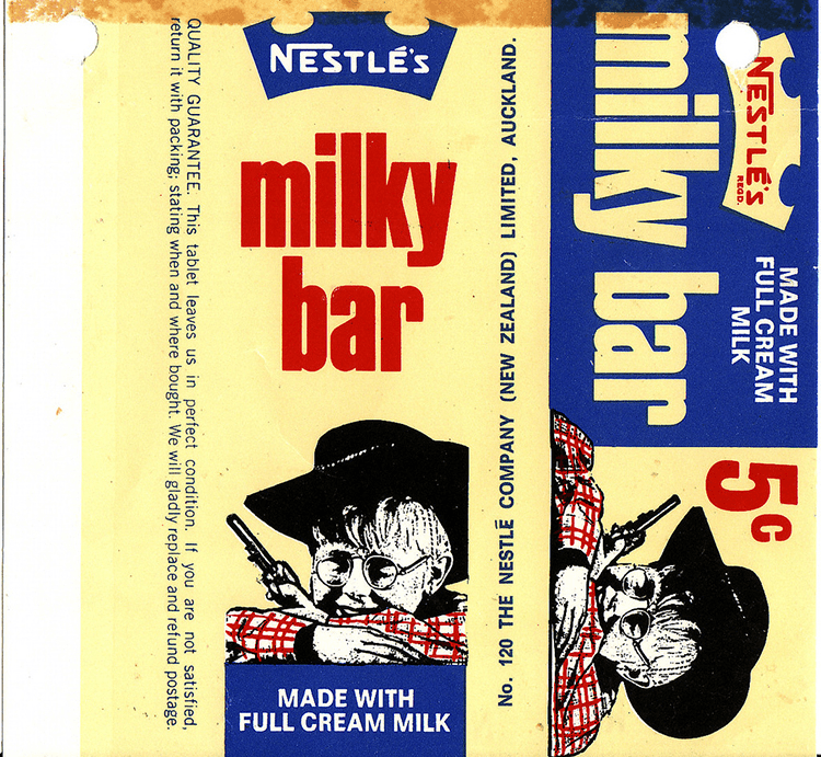 1969 Nestle Milky Bar Chocolate Wrapper. “Great early example of the classic “Milky Bar Kid” on a wrapper.”