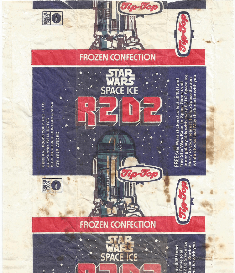 1977/78 Tip-Top Star Wars R2D2 Space Ice Block Wrapper. “One of the first NZ Star Wars Food premiums and from my favourite film series – my holy grail item!”