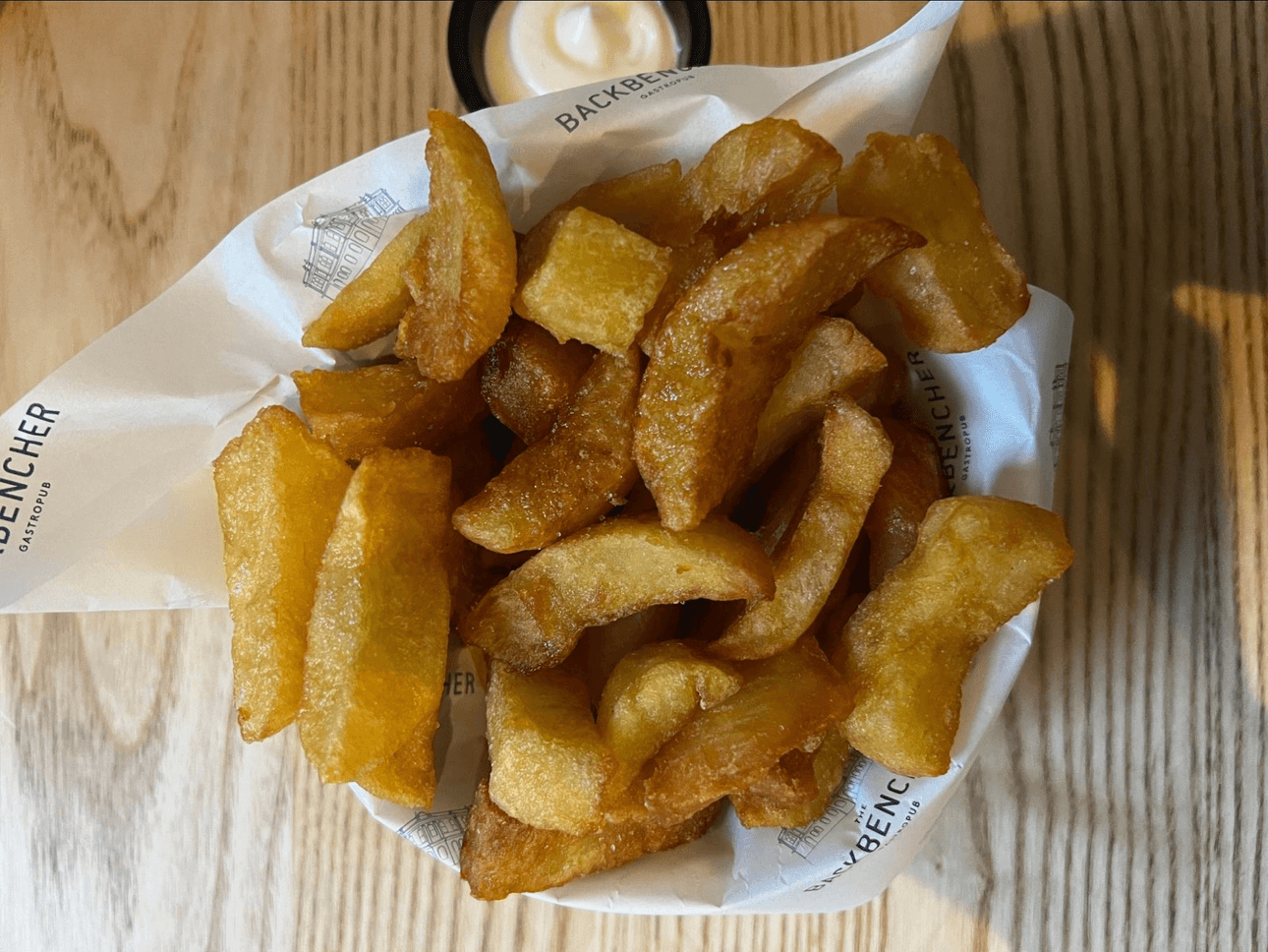 It also has chips. Like, proper chips. I think we all have an idea of what a proper chip would be, even if that idea is highly subjective and deeply personal. But the reality we all have to come to terms with is that the correct answer to what a proper chip is, is the ones at The Backbencher. They are unequivocally the direct descendant of Heston’s experiments back at The Fat Duck in the 90s. They are made on-site from scratch, and what is so remarkable is how far the chefs have taken them in the initial blanching stage. It is at this point in the cooking and subsequent drying process that all the fissures and cracks appear in the surface of the chip. The potatoes being allowed to cook all the way through before cooling right down means that when they are fried, that jagged shell we are all looking for forms around the fluffy interior. Hot oil sneaks into the fractured surface and creates depth and texture. In one pot, you will find chips of every size, texture and crispness.