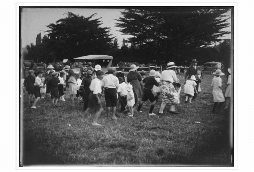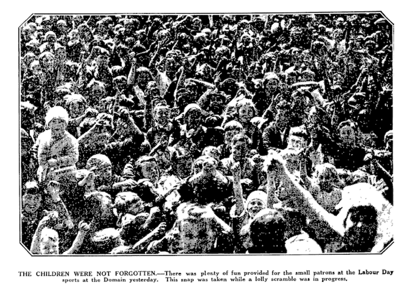 According to historian David Green, the earliest recorded New Zealand lolly scramble features in an 1870 article recapping a picnic in the Taieri Plains held by the Ancient Order of Foresters. “A ‘lolly scramble’ was entered into with great zest by the youngsters,” the article reads, “who were lavish in their praises to the Foresters and hoped that the pic-nic would come oftener.” Green notes the quote marks around ‘lolly scramble’ – a clue that the term was unfamiliar at the time.