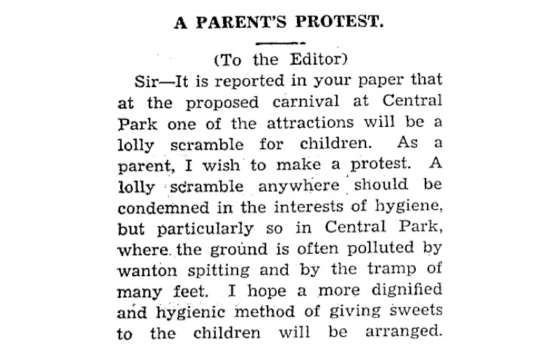 Parents would be well within their rights to be upset about, say, a school principal covering his body in sweets and running through a bunch of kids, but one 1935 letter to the Northern Advocate raises different concerns. “As a parent, I wish to make a protest,” the letter begins. “A lolly scramble anywhere should be condemned in the interests of hygiene, but particularly so in Central Park, where the ground is often polluted by wanton spitting and the tramp of many feet.”