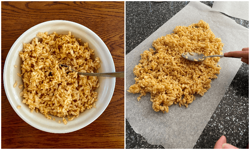 Quickly tip the honey mix into your mixing bowl of ricies and get stirring. The honey mix will start setting straight away so do not dither. Once it all seems evenly mixed together, tip it out on to baking paper sheet #1, then cover it with baking paper sheet #2 so you can squish it down cleanly. It will set fully once it is room temperature. My helpful kid has squished this lot very thin; this is not compulsory. It can be shaped into anything, really, and cut while still warm. Just make sure some of it is passed on to someone who needs a little dopamine burst of honey joy in their day.