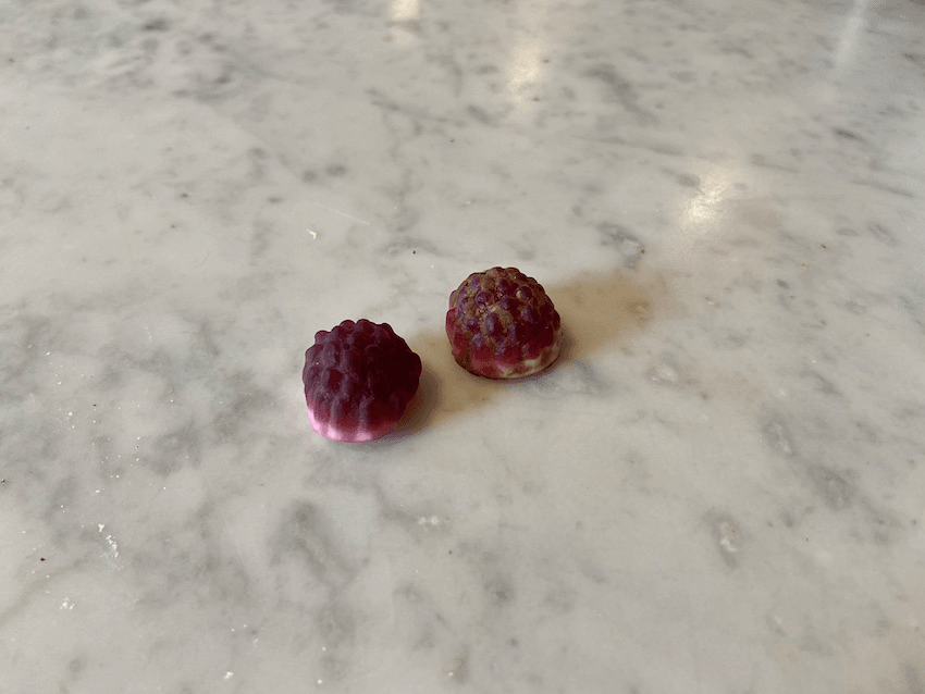 The Spinoff peeled off the chocolate from one of the soft gummies and found a lolly that appeared identical to the boysenberry and cream gummy produced by the Rainbow Confectionery company. There is no mention of Rainbow Confectionery on Potter Brothers’ packaging.