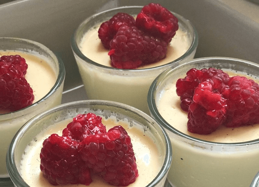 Unmould the panna cotta on to cold plates. It may help to briefly dip the moulds into warm water to help loosen the panna cotta before turning out. They should be just barely set. Serve immediately with a spoon of softly whipped cream, a few mint leaves and raspberries, when in season.