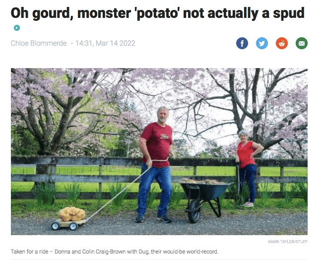 After months of no news, a horrible twist: Stuff reports that Dug the Spud is not who he says he is. An email from Guinness World Records sent to Dug’s minders over the weekend revealed that the results for his DNA test at Science & Advice for Scottish Agriculture have come through, and they’re not what the world was hoping for. Dug is a “tuber of a type of gourd”, rather than a potato, and is therefore out of the running to be the world’s next hot tater star.