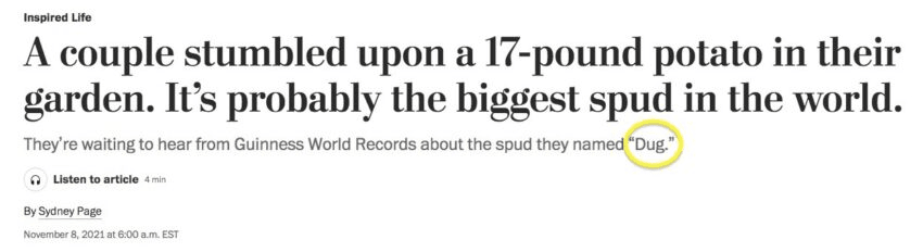 Doug makes it all the way to the Washington Post’s aptly named “Inspired Life” section, where a spelling scandal is revealed that will rock Doug fans to their nodes. The tater’s title has been misspelled throughout his whirlwind press tour and his name is actually DUG, not DOUG. “Because we dug him up. Plain and simple,” says Colin.