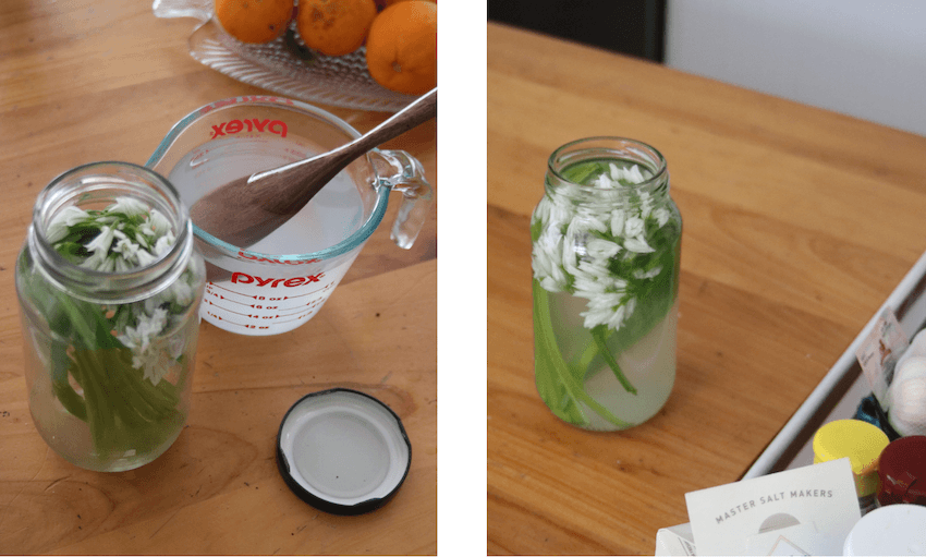 Give your weeds an extra good clean. Dirt is no friend to fermenting. Curl a handful of the stalks with flowers still intact into a sterilised jar. Cover with brine (I like to go with the ratio of one tablespoon of salt for each cup of water) and store in a dark part of your pantry for at least two weeks. Use in salads, to top rice or in sandwiches.