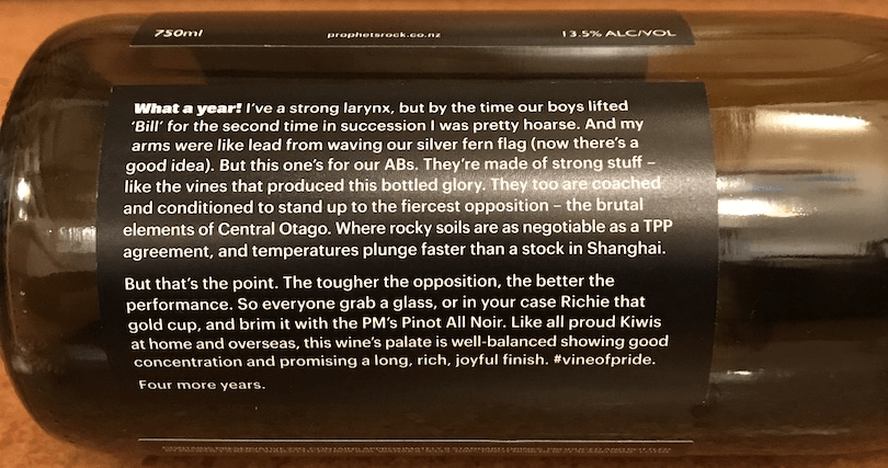 The wine, which came out in 2015, doesn’t look like a regular Prophet’s Rock wine. It’s branded with a fancy, stylised JK, and has been signed personally by our man in Parnell. It looks very stylish, but the best part about the bottle is the blurb, clearly written by somebody who was having an enormous amount of fun.