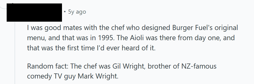 Even so, what kind of company wouldn’t want to comment on a story entirely focused on the deliciousness of its best product? What does this chain have to fear? The answer may lie in an old Reddit post positing an incisive and relatable question. “Why is aioli so popular in NZ?” it asks. A horde of people respond crediting BurgerFuel with popularising the sauce. Among them is one who delivers some tantalising extra information. “I was good mates with the chef who designed BurgerFuel’s original menu, and that was in 1995. The aioli was there from day one, and that was the first time I’d ever heard of it,” the person says, before adding a kicker. “Random fact: The chef was Gil Wright, brother of NZ-famous comedy TV guy Mark Wright.”