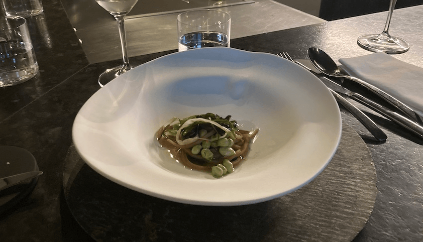 He said this is his take on two-minute noodles, but the reality is that those bananas were biffed in his suitcase from Kelmarna Gardens in central Auckland, pureed, steamed for 30 minutes, flattened out, left to sit for 24 hours, then hand cut. “One by one,” he said. “That’s what I do for you.” Two-minute noodles are a lot closer to 36-hour noodles. Next came an intricate spinach and silverbeet mille feuille with snapper for the meat eaters, curious white asparagus for me.