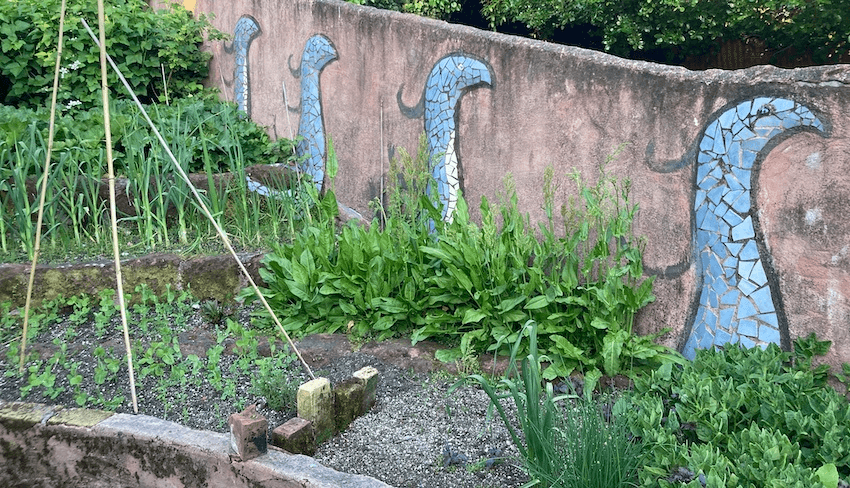 We moseyed outside to his lush garden, guarded by six mosaic taniwha. “The kitchen starts here,” Sturla explained. He showed us his bountiful crops of potatoes, yams, artichokes, rhubarb, onion and peas, and the peach trees. Even the wood of his grape vine and blackcurrant tree go into the barbecue to create various sweet-smoky flavours. “I never know what people are talking about when they talk about food waste,” he later said. “Nature doesn’t make waste.”