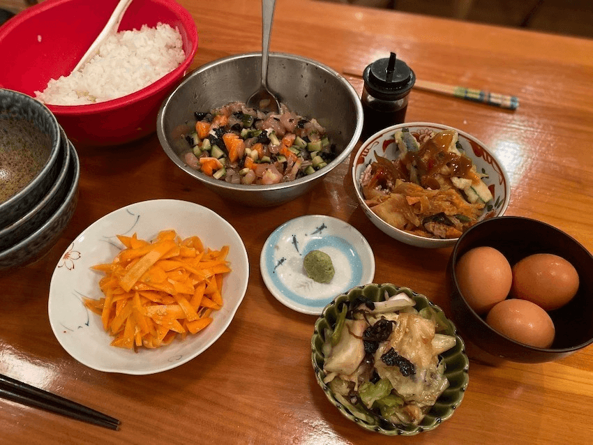 At Auckland Japanese restaurant Sake Bar Icco: “This was our staff meal for Saturday dinner at the restaurant at 11pm, after work. Ikko (owner/ head chef), Hiroshi (second chef) and I ate it at the restaurant. Diced sashimi fish marinated in yuzu citrus dressing, tempura courgettes and crispy rice, pickled carrot, pickled cabbage, egg and rice.” – Junko, co-owner/ manager