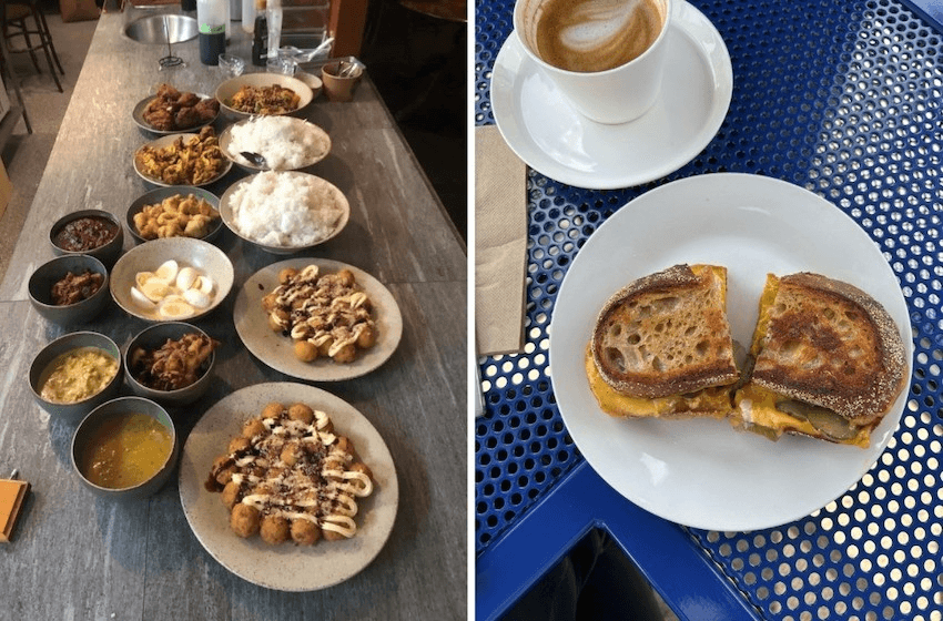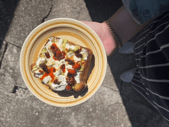At Auckland cafe Burnt Butter Diner: “Our go-to snack on the run – a slice of our purple wholemeal bread (which I bake for the daily sandwich) toasted up with the dregs of avocado, labneh & fermented chilli oil. A fried egg added if we’re feeling particularly fancy.” – Claudia, co-owner/ pastry chef