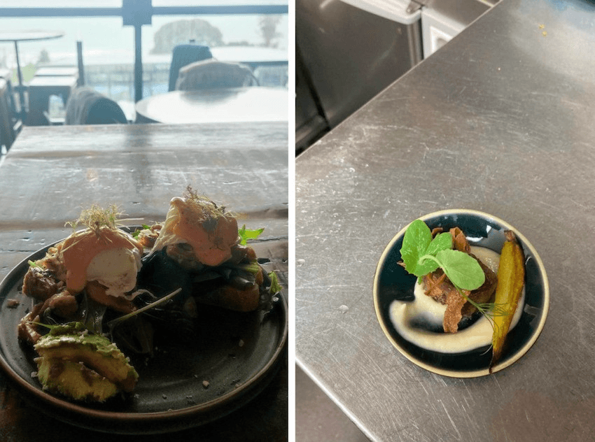 At Waiheke wine bar Aperitivo: “A pork belly benny with a side of avocado: poached eggs, sriracha mayo, greens, toasted sourdough with a bit of olive oil and salt and with pork belly and avocado. And, also a little bite: slow cooked rib, parsnip puree, parsnip chip with fennel and nasturtium. This was during a proper double [shift], 11am till 11pm. We get breakfast at 1.30pm or so, dinner just after service, when it quietens down, be that 7.30 or 10pm.” – Anon