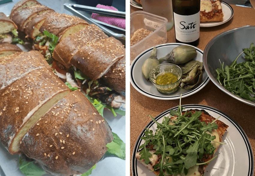 At Auckland bakery Florets: “We work really hard to end the day with little to no food waste, so when it comes to team lunches we always use up bread ends, and any ingredients we have in excess. For breakfast we make mini buns with leftover dough for the team and serve these with Danbo cheese and plum jam. This mushroom sandwich shows how we used the stems of roasted button mushrooms that were not included in our sandwiches. We always have a batch of cold brew for afternoon coffee too.” – Maya Handley, owner