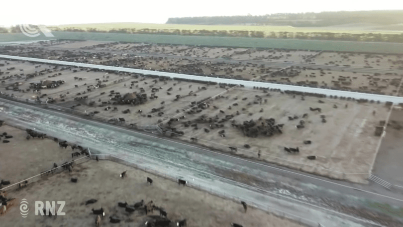 Fifteen minutes out of Ashburton, thousands upon thousands of cattle are penned in grassless paddocks. The cows are meat animals, spending their final days held in these so-called feedlots being “grain finished” before being slaughtered and sent to market here and abroad.