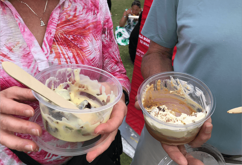 “Quick, take a picture before it’s all gone.” Te Matatini first-timers Steve and Philippa Fitzsimons are visiting from Vancouver. They’re eating steamed pudding with custard and banoffee pie.