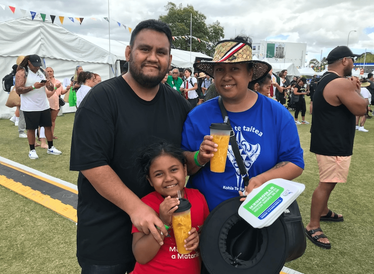 Rob Anderson, Sian Roberts and Terina Anderson rehydrate with tall cups of ōtai.