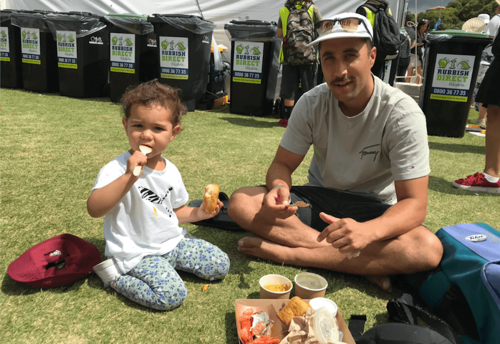 Te Whai Ao Manga and Te Amiorangi Manga with their kaimoana and fry bread lunch from Toby’s Seafood stall.