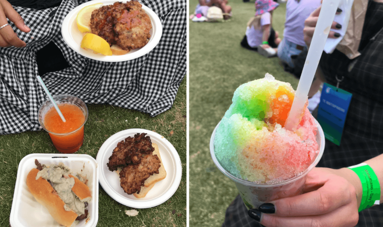 Left: Mussel fritters and a Cook Island steak and mushroom sauce roll. Right: A rainbow shaved ice.
