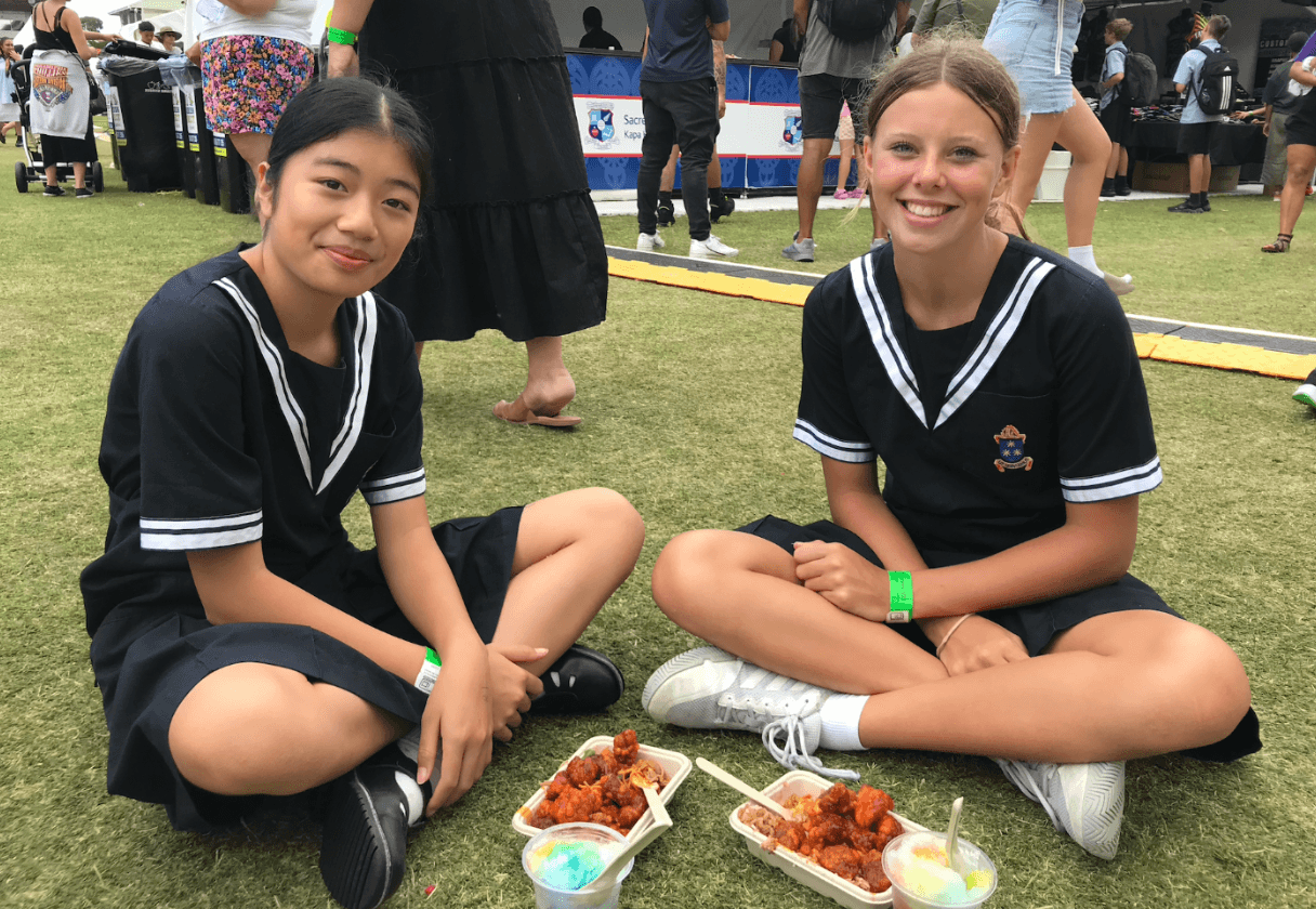 Students Claudia and Jessica take a break between performances with sweet and sour pork and fried noodle boxes. They take te reo Māori as a subject at school and this is their first time at Te Matatini.
