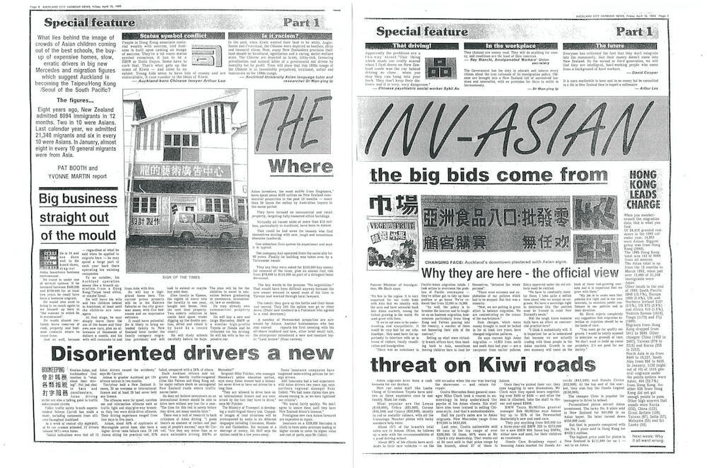 The influx of Asian migrants in the late 1980s and 90s revived anti-Asian fear and intolerance. While the number of Chinese people in Aotearoa was growing by tens of thousands, they comprised no more than 2.3% of the country’s population in 1996. Pat Booth and Yvonne Martin’s 1993 “Asian Inv-asian” article captured an anti-Asian sentiment echoed by Winston Peters’ 1996 anti-immigration speech in Howick. Commentator Vincent Heeringa wrote in Metro that the speech repeated clichés that Asian immigrants are “all criminals … they’re a danger to our children … they’re taking our jobs … they come from poor countries but they’re richer than us … they’re screwing us.”