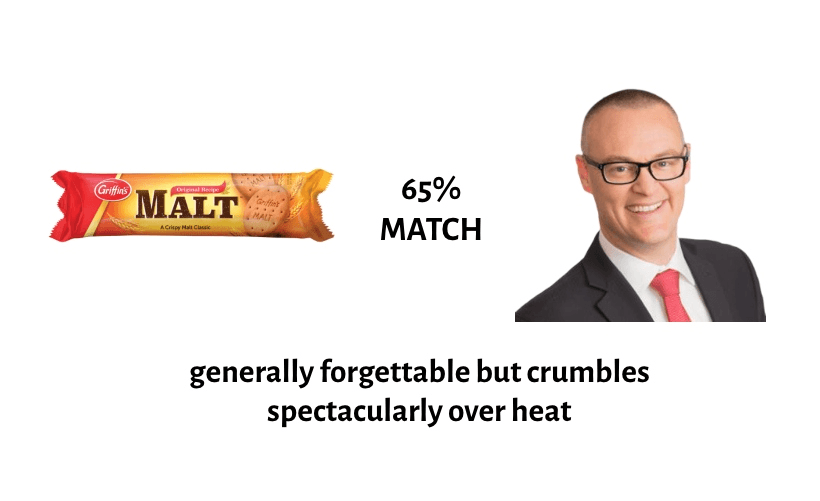 There are two ways that biscuits can be eaten: on their own (cold), or with a drink (hot). Chocolate Butternut Snap is a medallist in both categories: it’s the second best biscuit to eat on its own (behind Yellow Squiggle) and the third best to dip (behind Tim Tam Double Coat and gingernuts). This is why it has to be number one. Meryl wishes she had such range.