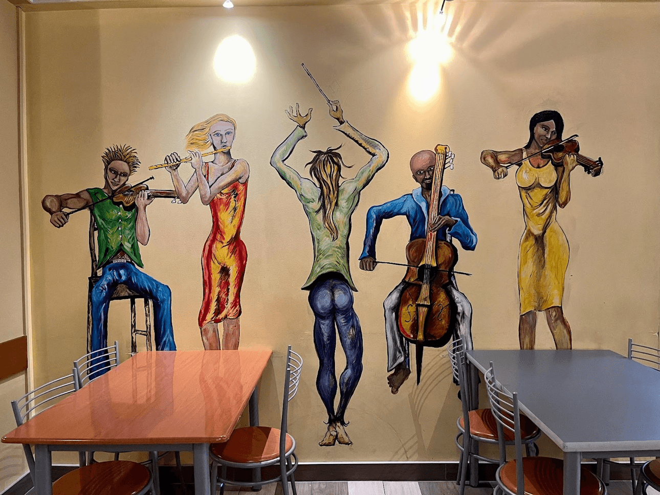 Once again, we are treated to bright yellow walls, which always cheers me up. There’s also this huge mural of what I can only describe as a “perky” group of musicians. I assume it was inherited rather than a proactive design choice, and I am absolutely here for it.