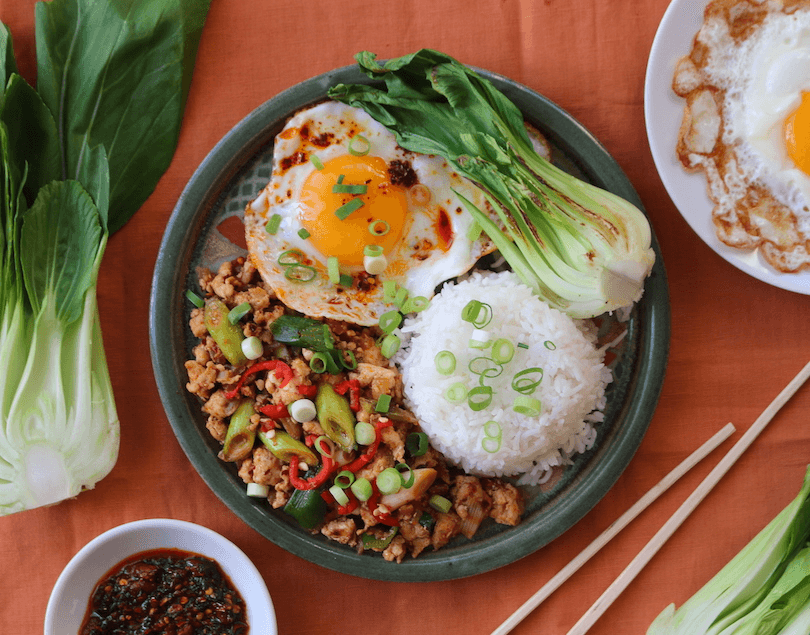 A few of my favourites are Teriyaki chicken and bok choy on ginger-infused sushi rice; chilli-fried chicken mince, seared bok choy, and a crispy fried egg; and bok choy simmered in a fragrant broth with premade dumplings or ginger and pork meatballs.