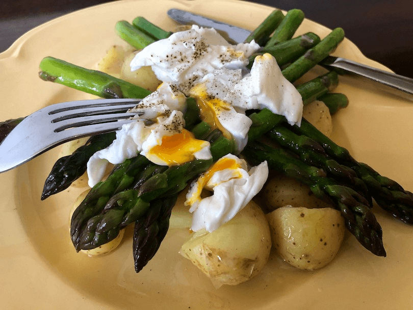 I won’t patronise you by telling you how to cook a potato or a bunch of asparagus – just choose fresh, new produce, boil things briefly and you are already a winner. Toss the vege in the garlic vinaigrette when still warm, place on individual plates, poach your eggs and pop on the top. A bit of pepper and you’re away.