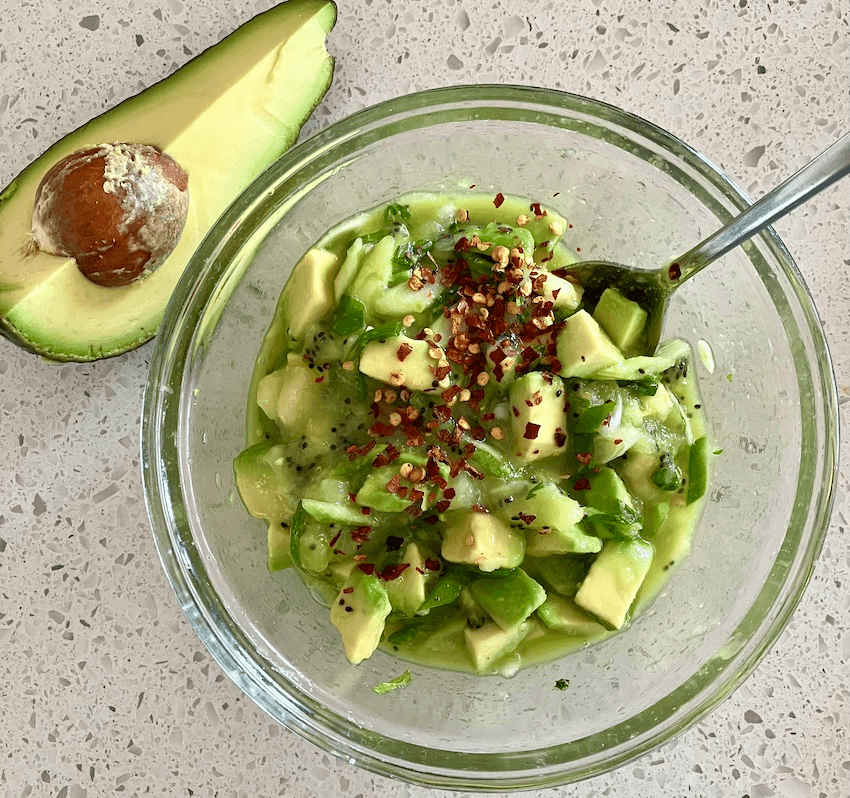 But if you want to get creative, kiwifruit also makes an excellent base for a tangy hot sauce, chutney or salsa. My current favourite is this kiwifruit, avocado and mint salsa to top off crunchy Panko crumbed fish burgers (see opening image). It tastes light, fresh and summery, and the salsa uses both golden and green kiwifruit, so no one’s being left out.