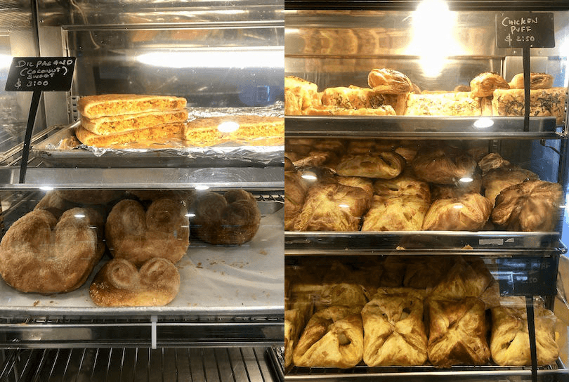 For $11, I got a vegetable puff, a Mughlai chicken puff, a dilpasand, “bread cake”, and something that looked like a palmier but I think was labelled a sweet biscuit.