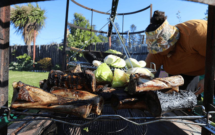 “We use macrocarpa,” he told The Spinoff. “It provides a dry, hot heat which means the kai gets well-cooked. In comparison, wet wood provides a cold heat. When smoking fish or smoking meat, though, plum tree is great as it mixes in a really nice flavour.”