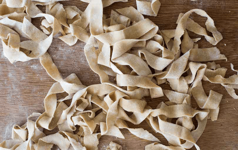 I’ll never forget the first time I made pasta. I was 13 or 14 and we lived in a country called Brunei on the island of Borneo. Our neighbours were from the UK and introduced me to the River Cafe cookbooks, which I pored over, cooking three-course feasts from them that I served to my parents and their friends. It was during this time that we also made pasta. Despite the humid heat (we had no air-conditioning), we set to work kneading the dough, folding and rolling, folding and rolling. Lastly we cut the pasta sheets into fettuccine and hung them over broom handles resting between two chairs. I was hooked and have made pasta on and off ever since. This is the version I now make, using a sourdough starter, which makes the pasta more digestible and gives it a slight sour flavour (it’s not overpowering, don’t worry). And if my six, four and two-year-old kids are anything to go by, it’s “better than the supermarket kind”!