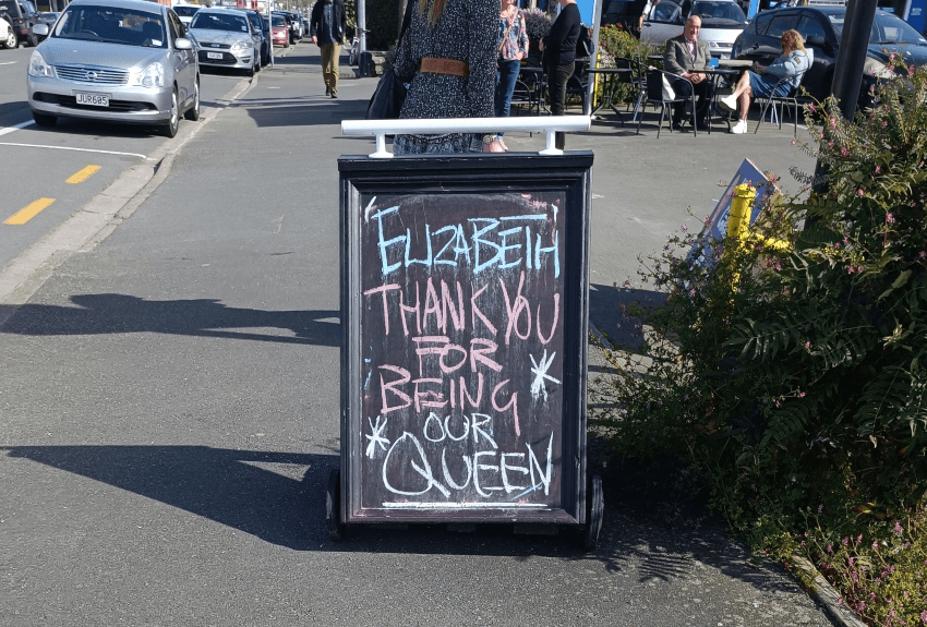 The Queen was remembered across the streets of Whakatū through the weekend. A forlorn New Zealand flag hung at half-mast at the car rental place on Haven Road; a tino rangatiratanga flag did the same outside a Trafalgar Street motel. “ELIZABETH,” said the sign on Vanguard Street outside Tozzetti Cafe in chalk, “THANK YOU FOR BEING OUR QUEEN.”