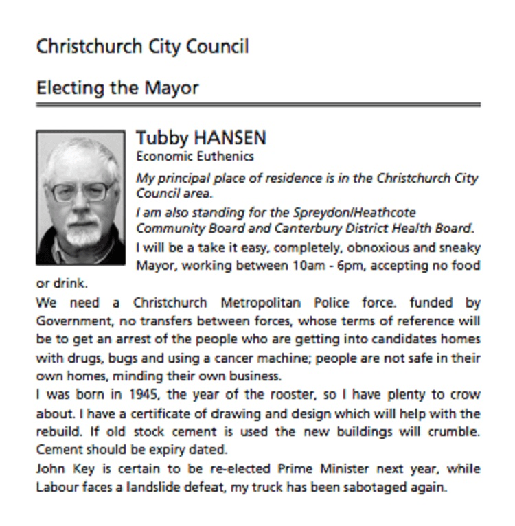 Veteran mayoral contender Tubby Hansen wrote what was easily New Zealand’s most evocative candidate blurb in 2016. It begins with a promise to be a “take it easy, completely, obnoxious and sneaky Mayor”. But its closing line has stuck with me the longest. “John Key is certain to be re-elected Prime Minister next year, while Labour faces a landslide defeat, my truck has been sabotaged again,” it reads. There’s something about that abrupt swing from impersonal partisan prediction to deeply felt, immediate concern that lingers. The vulnerability of those last six words reframes and informs the bravado of the first 17. Behind all Tubby’s political posturing, he’s just a man who’s worried about his truck. Perhaps that’s true of us all in some way.