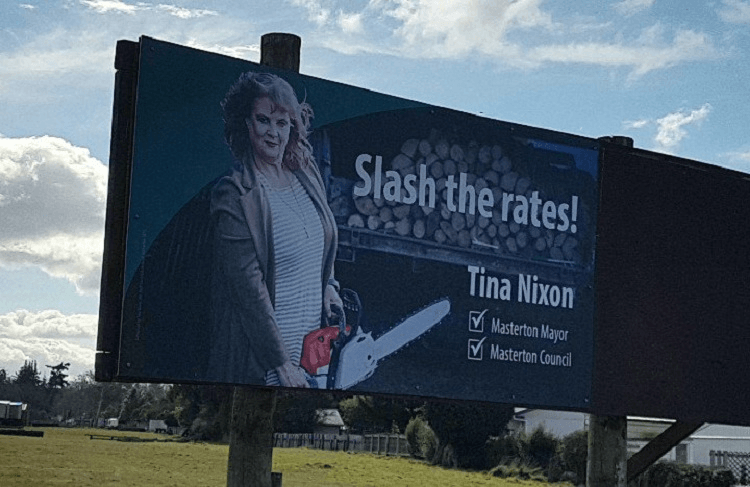 Promising to lower rates without offering details about which council services will be cut is meaningless and hollow. Despite that, Masterton candidate Tina Nixon is still the owner of the best billboard in the country. UPDATE: Tina Nixon has responded on Twitter.